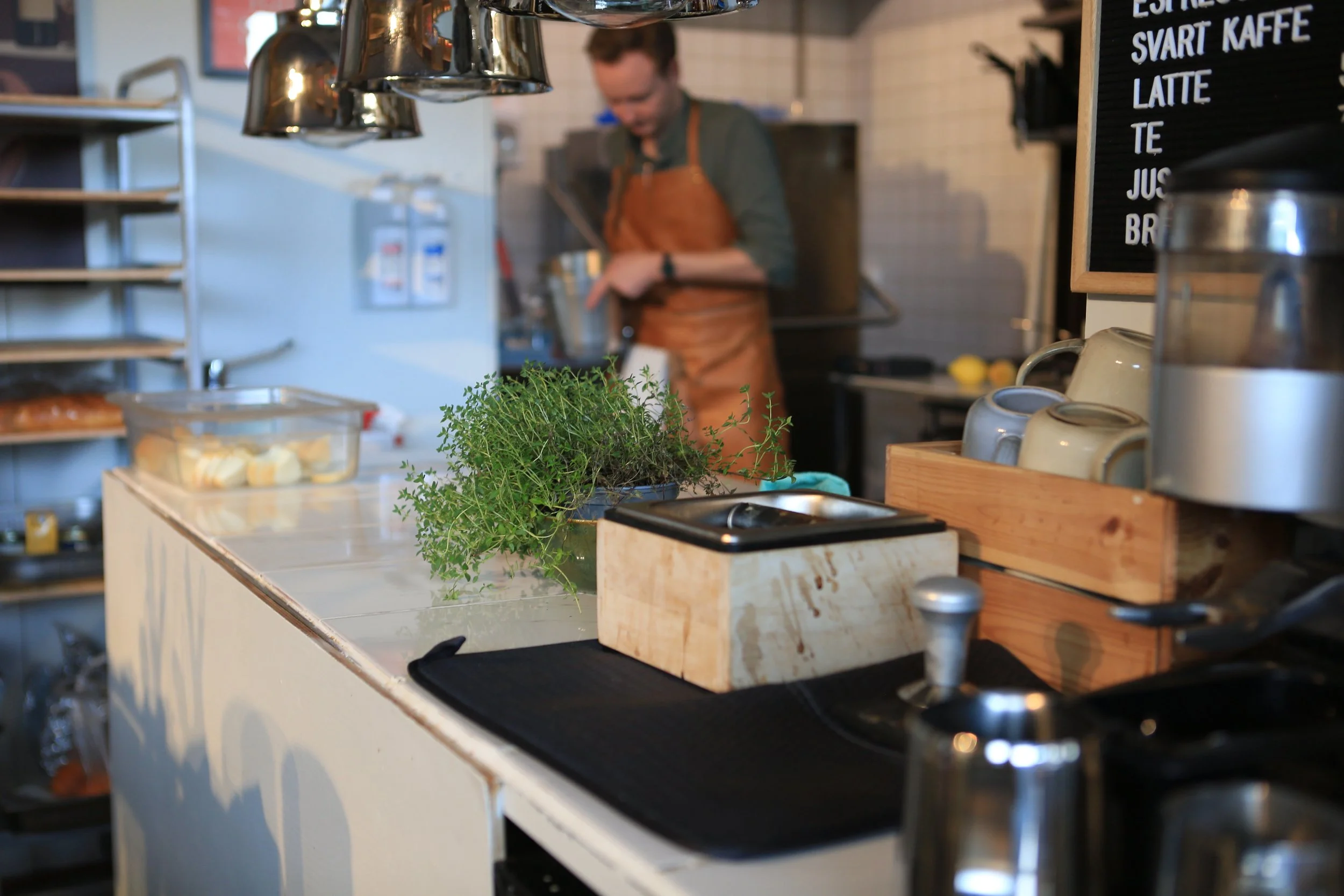 A barista preparing drinks behind a counter in a coffee shop with a blackboard menu on the right and various kitchen items in the background.
