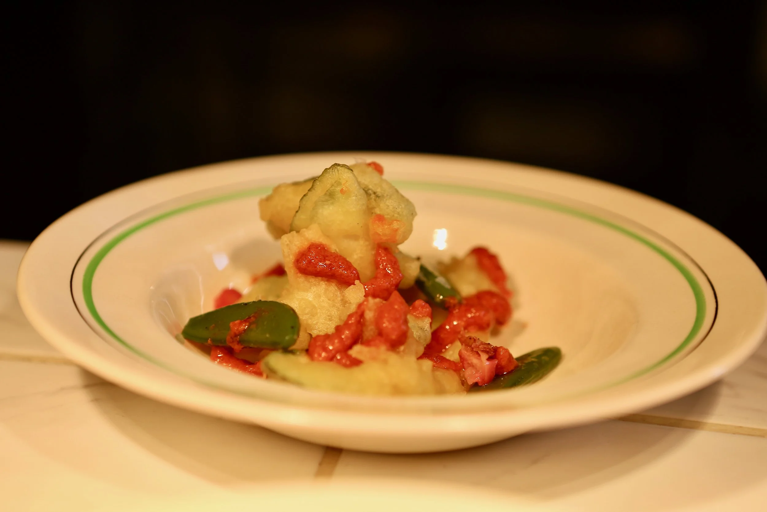 Fried vegetables with red sauce and green peppers served on a white plate with green and black rim.