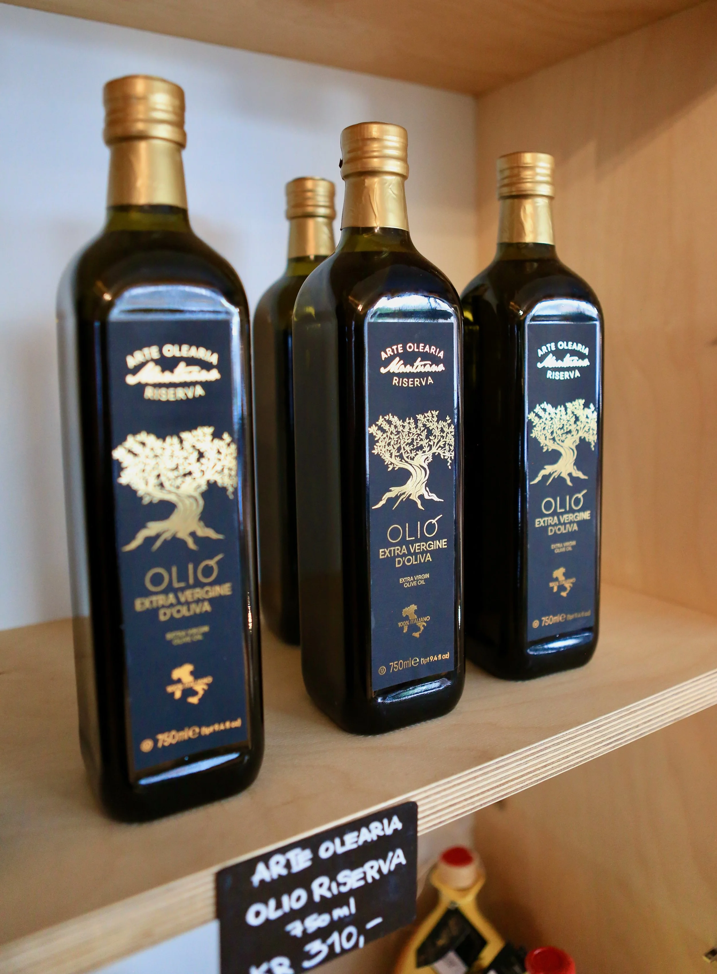 Four bottles of Arte Olearia extra virgin olive oil with black labels featuring a gold olive tree, placed on a wooden shelf in a store.