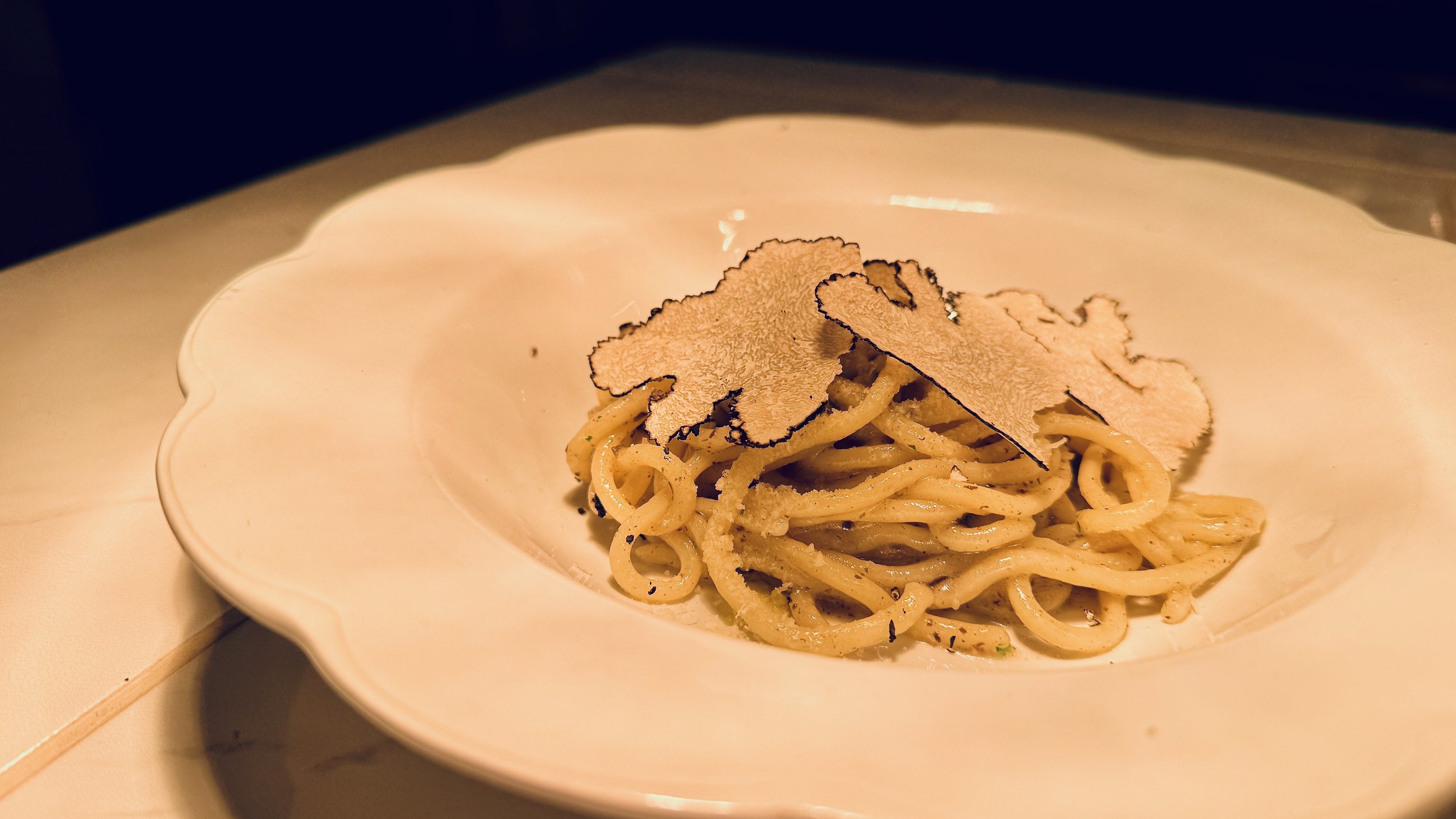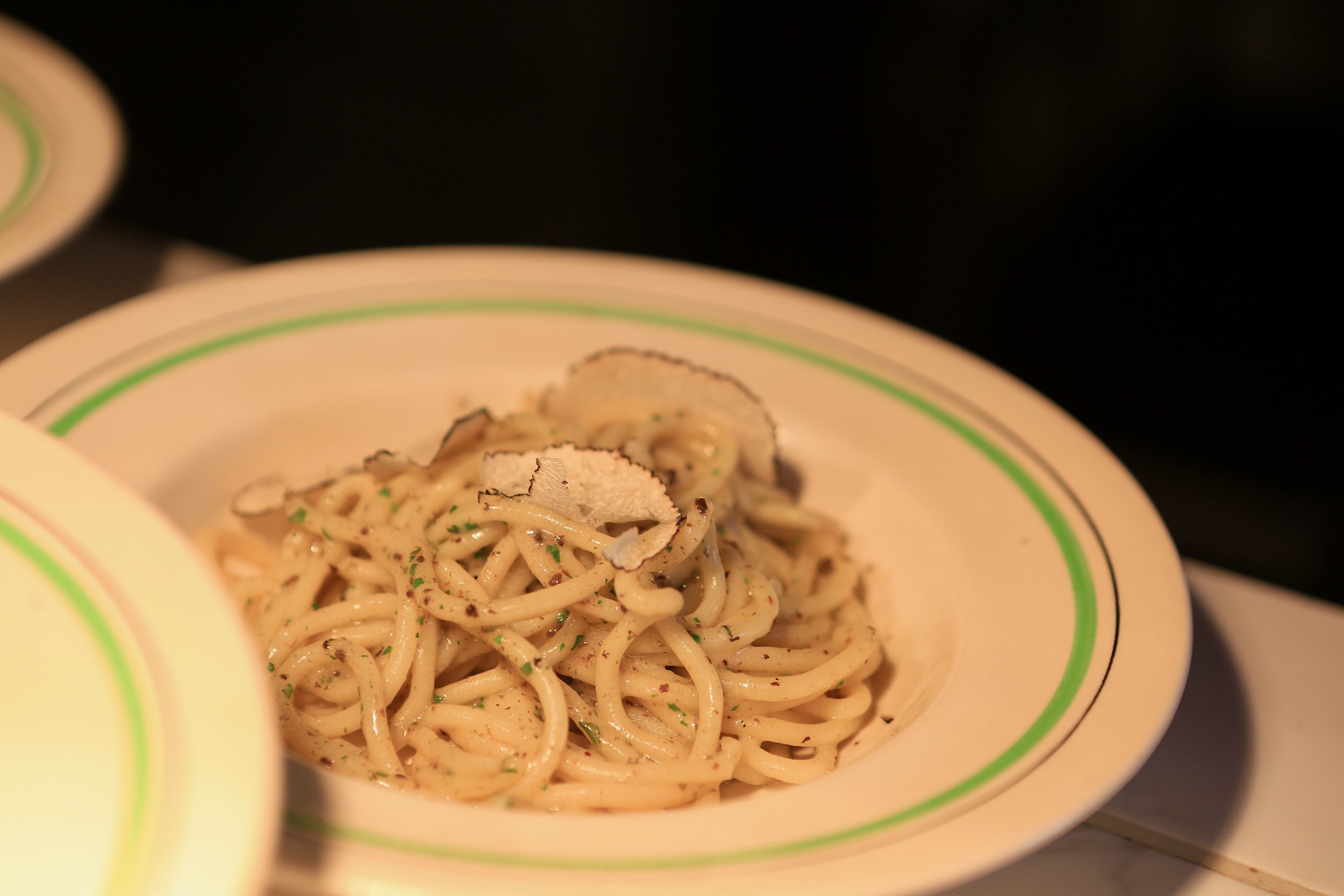 Plate of creamy pasta with shaved black truffles and chopped herbs.
