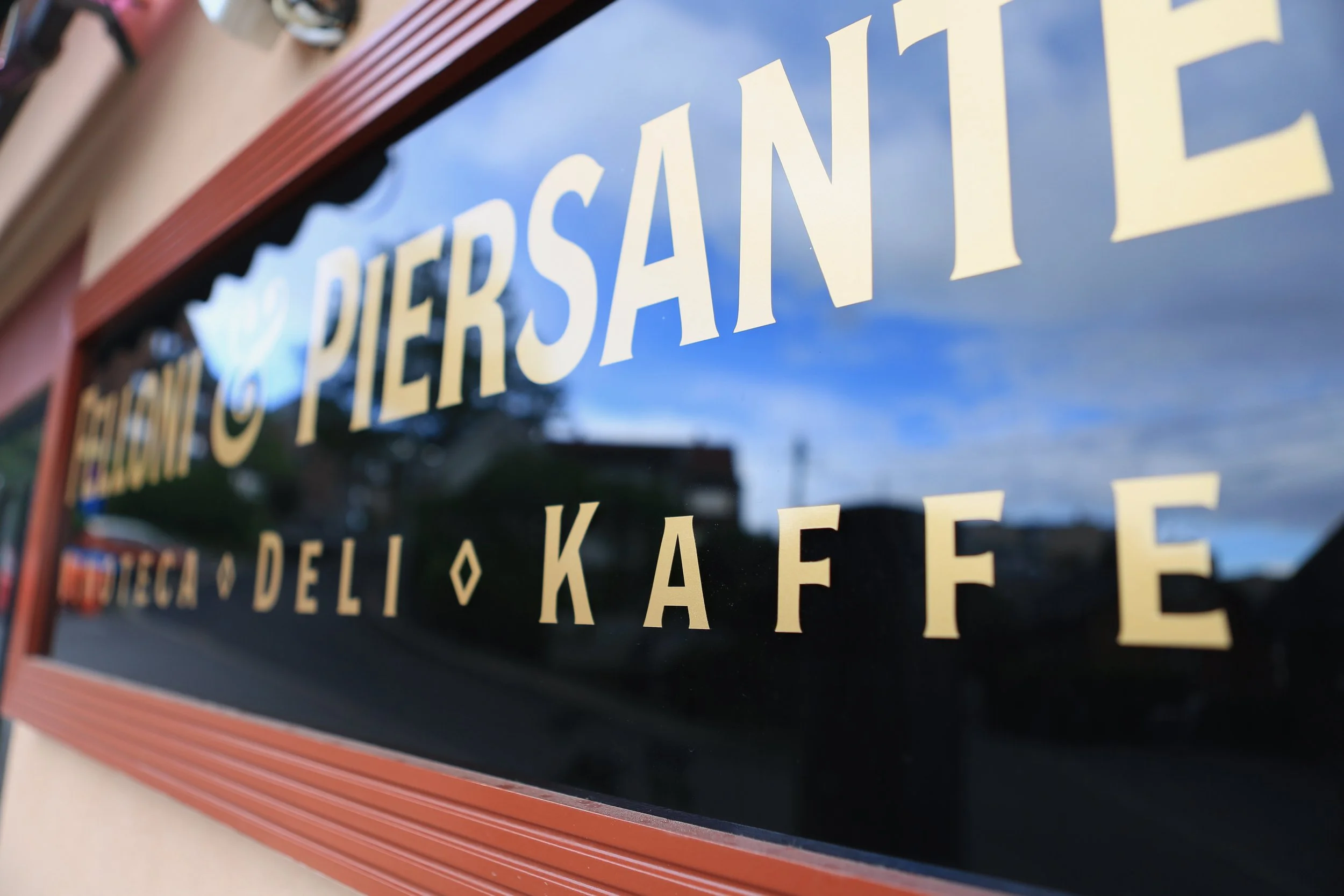 Sign on a window with the words 'Pierasant', 'Deli', and 'Kaffe' in yellow lettering, reflecting a partly cloudy sky.