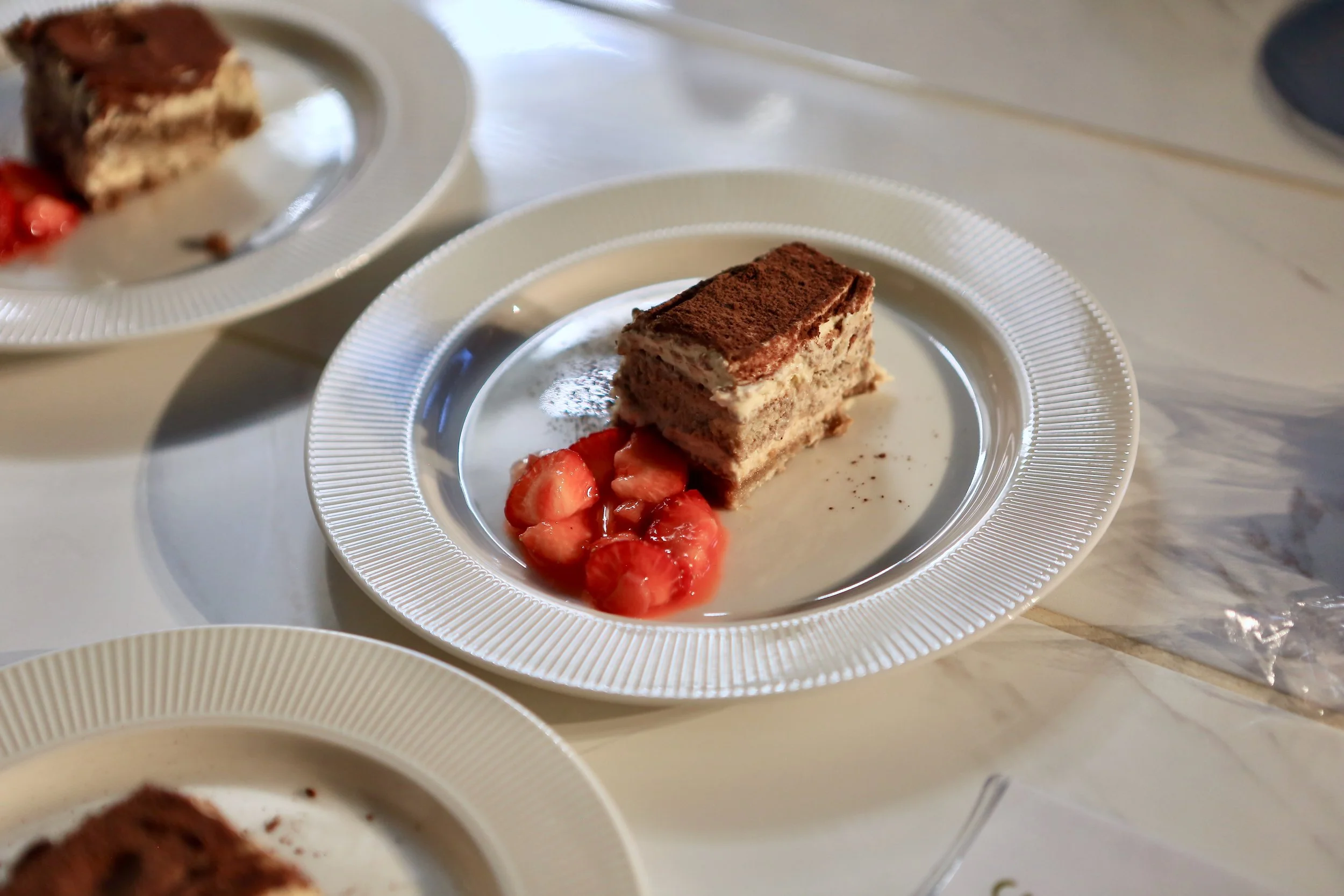 A plate with a slice of layered tiramisu dessert garnished with fresh strawberries.