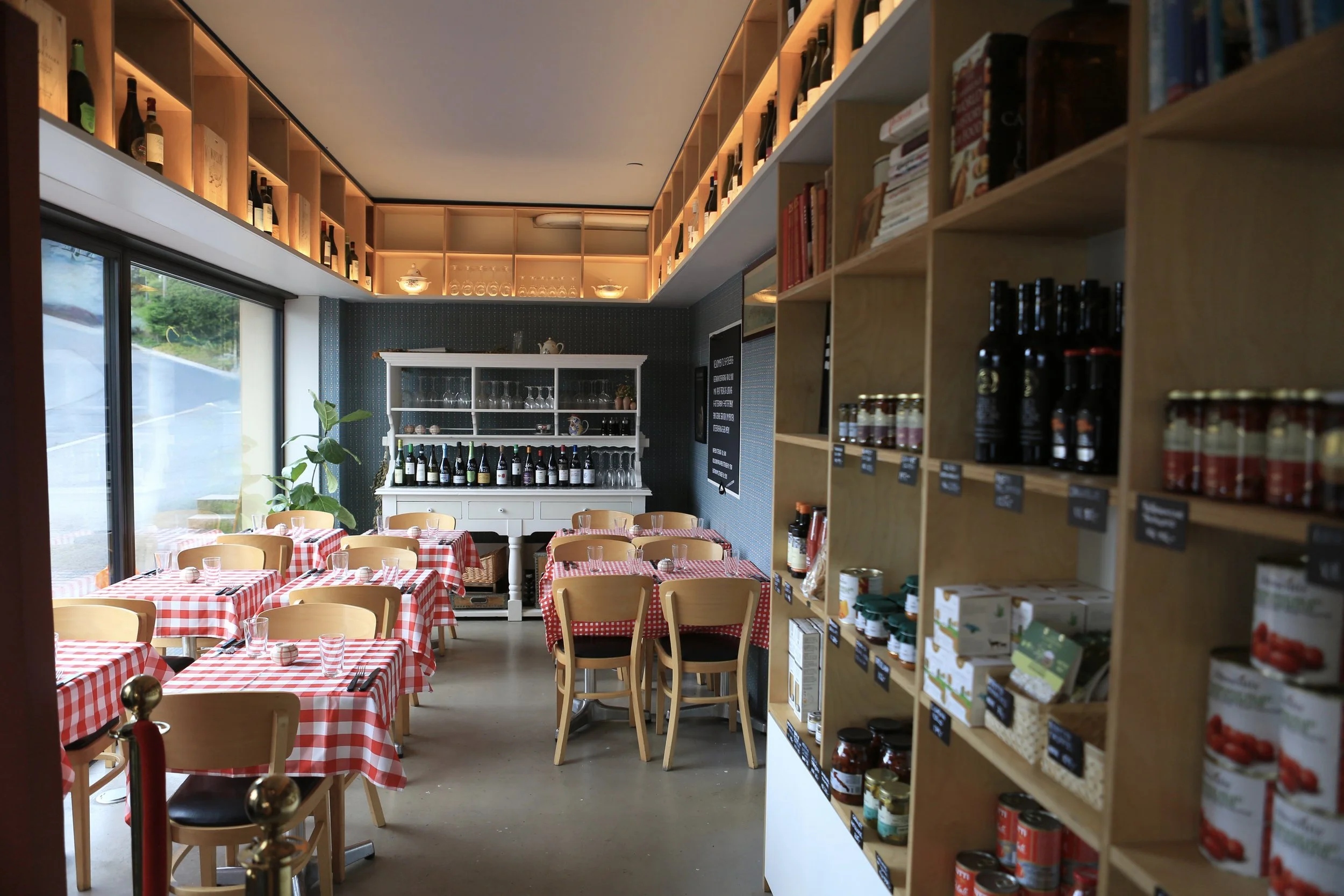 Inside a cozy restaurant with tables covered in red and white checkered tablecloths, set with glasses and utensils. Shelves stocked with bottles, canned goods, and condiments line the walls. There is a large window letting in natural light, and a dis