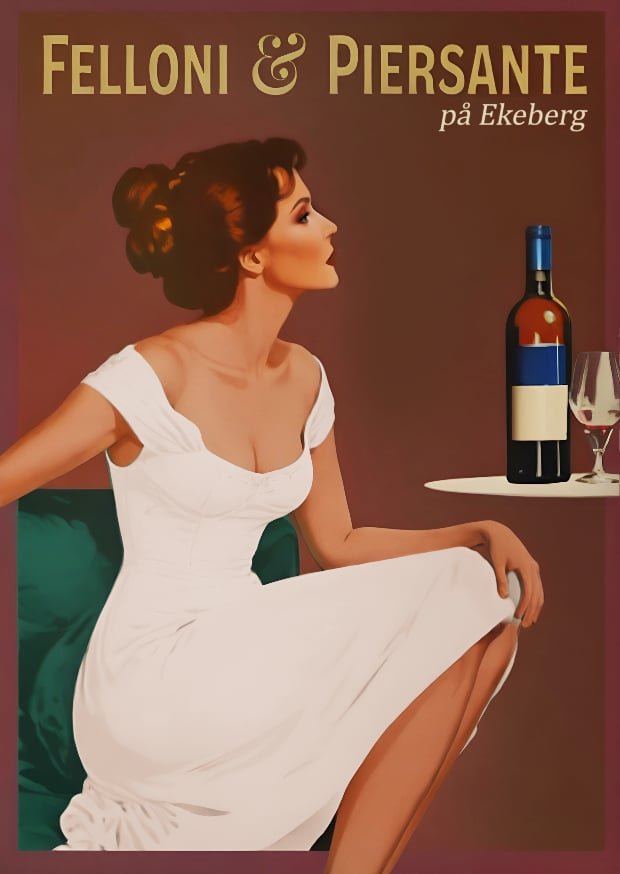 Poster featuring a woman in a white dress with styled hair, sitting on a green chair, with a bottle of wine and a glass on a table beside her. Text reads 'Felloni & Piersante på Ekeberg'.