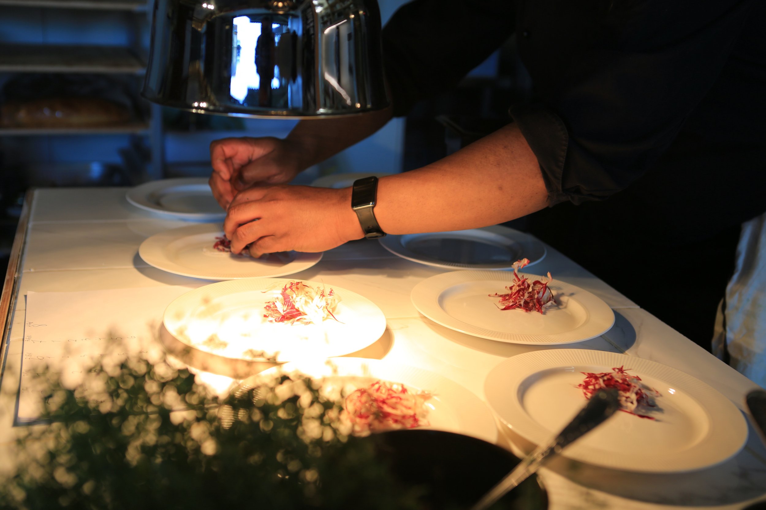 Chef preparing gourmet dishes in a professional kitchen with multiple white plates, some garnished with red and white ingredients, under overhead lighting.